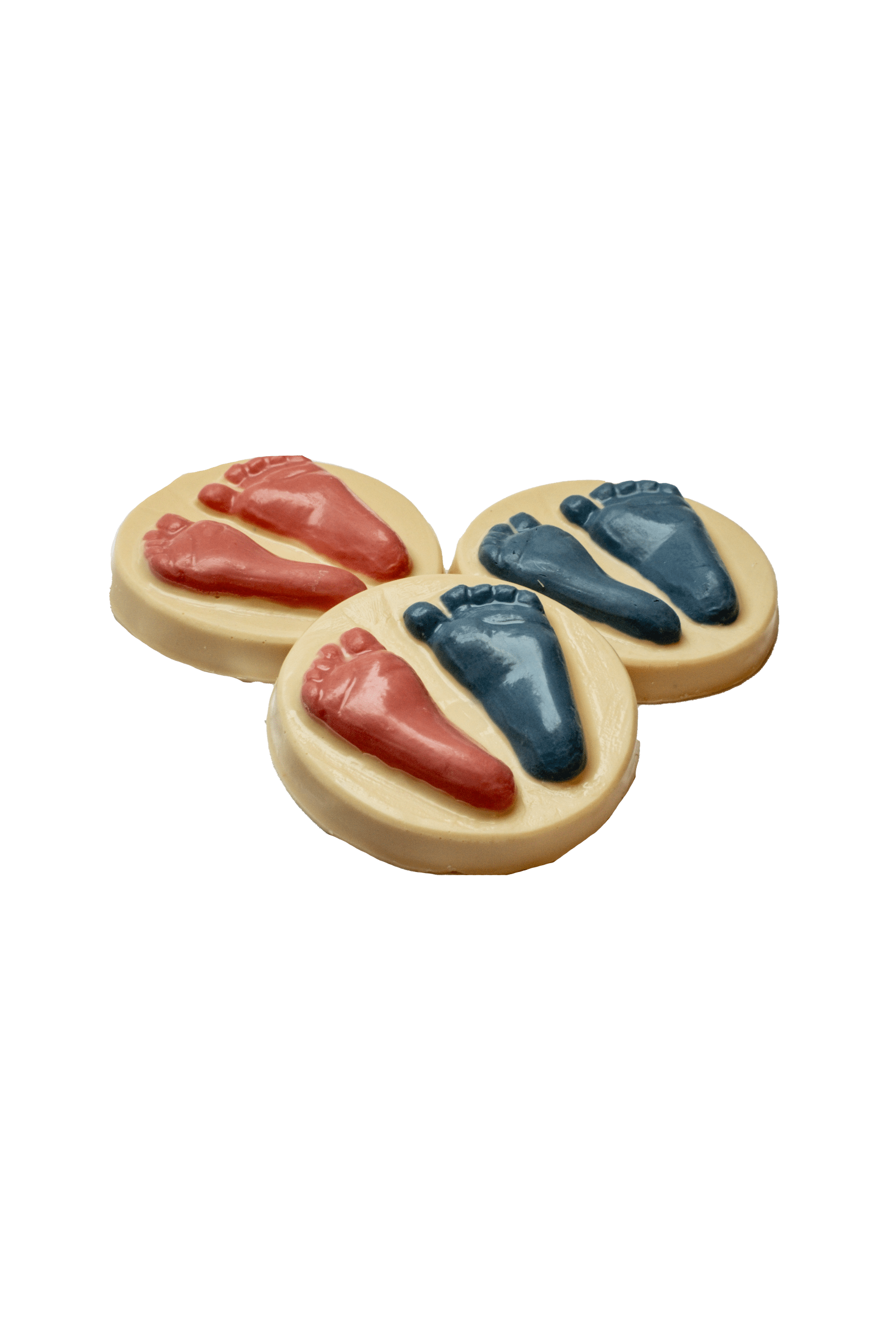 Geboorte voetjes in de kleuren blauw, roze of een combi van blauw en roze gevuld met praliné Karamel Amandel-Butterscotch omhuld met melk chocolade.