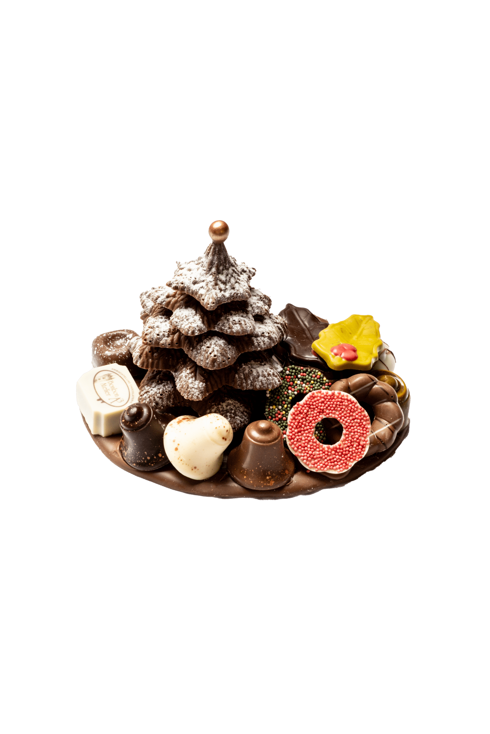 Een Kerst stukje van melkchocolade met  een assortiment Kerst chocolade en bonbons.