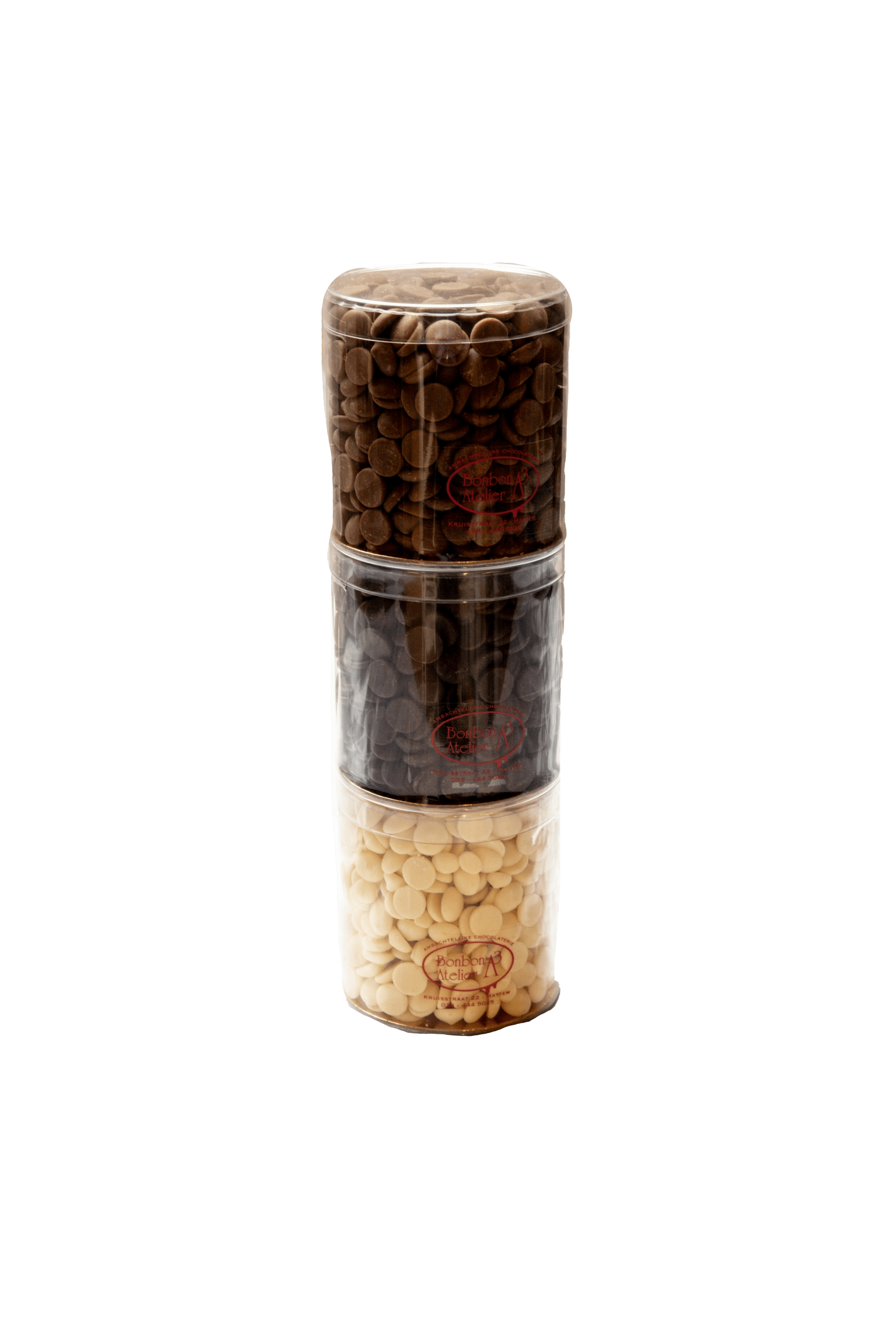 Ronde koker gevuld met callets in melk, wit of pure chocolade. De chocolade kan gebruikt worden om chocolademelk van te maken en is ook heerlijk in diverse gerechten.