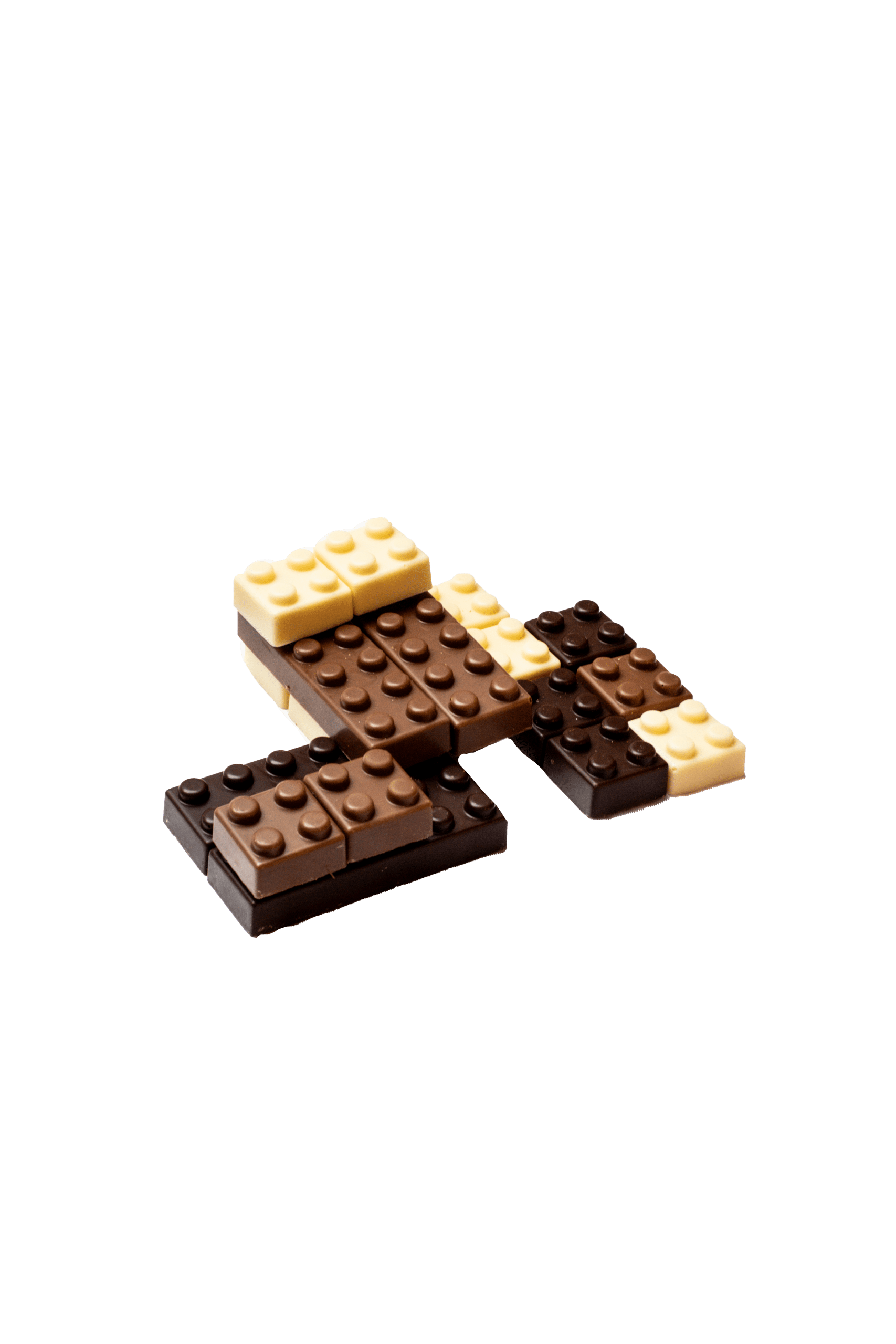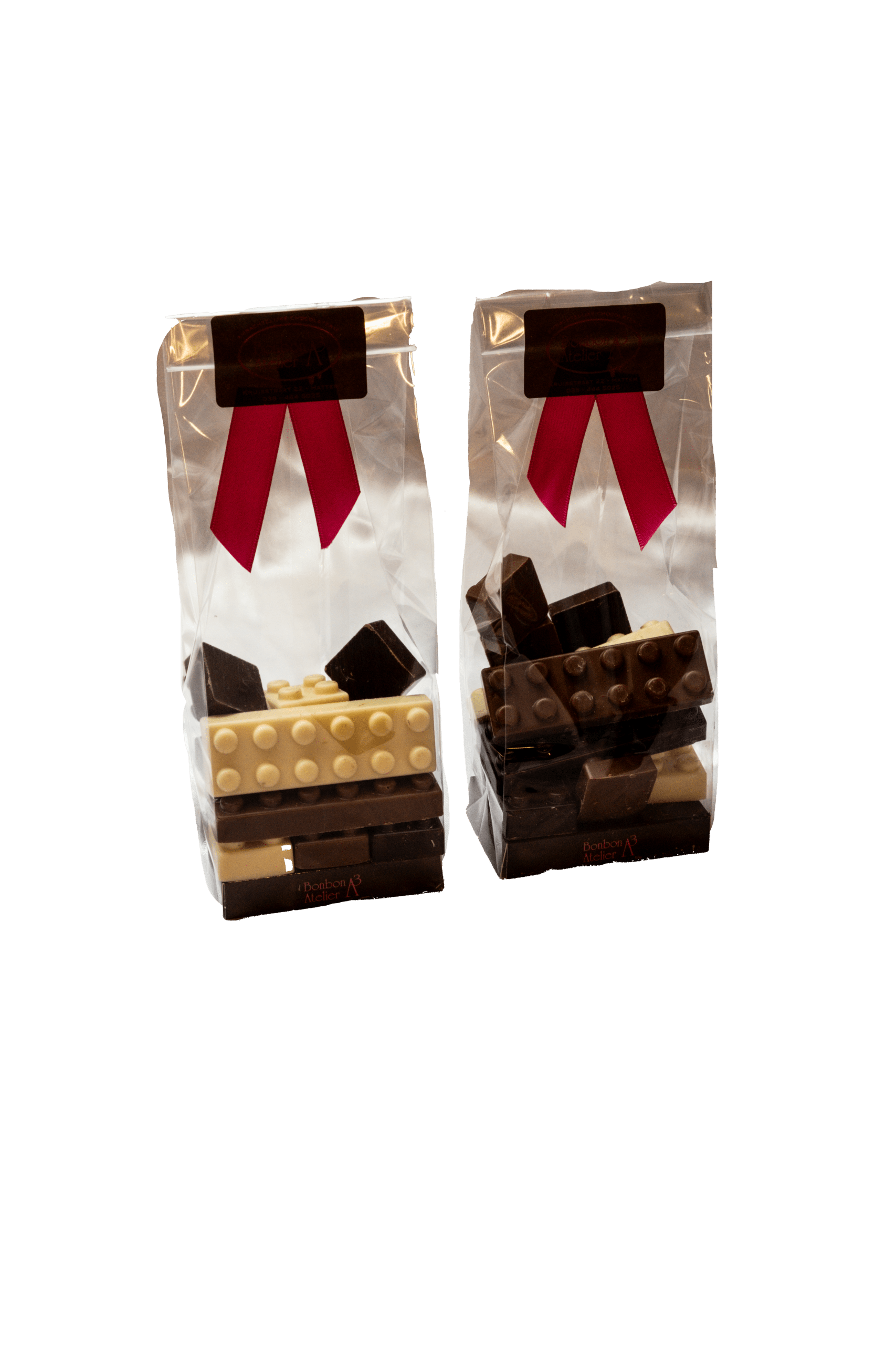 Zakje gevuld met chocolade lego blokjes in de smaken melk, wit en puur.