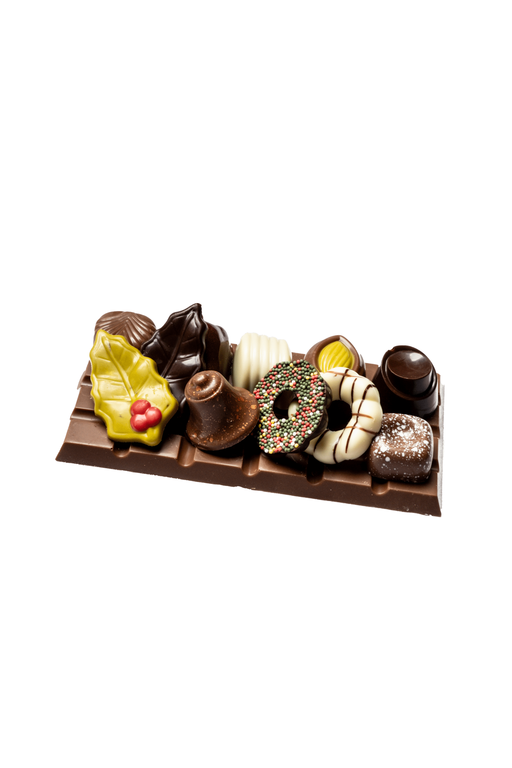 De chocolade plak is gemaakt van melk chocolade met een heerlijk assortiment van ambachtelijke Kerst bonbons en chocolade.